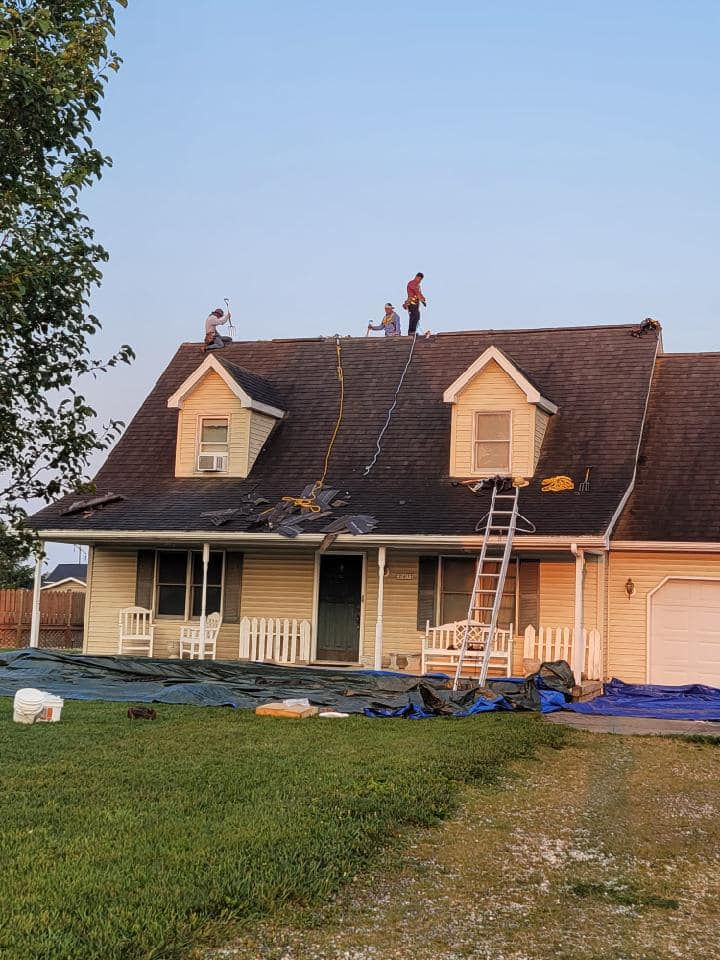 This project showcases various residential roof installations, including shingled roofs, metal roofs, and roofing underlayment. The images depict workers installing roofing underlayment, repairing roofs, and newly constructed houses with different roof types.